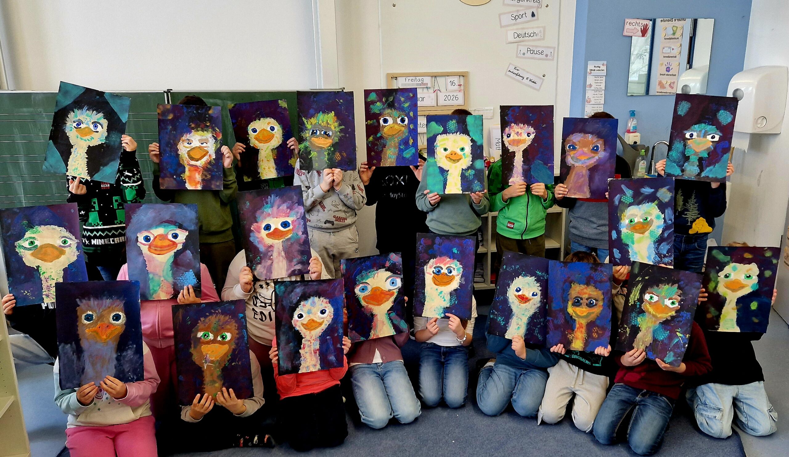 Im Kunstunterricht entstanden – inspiriert von den Arbeiten der Künstlerin Manuela Rathje – ausdrucksstarke Straußenporträts. Parallel dazu setzten sich die Schülerinnen und Schüler im Deutschunterricht sprachlich mit ihren Kunstwerken auseinander, beschrieben diese und formulierten eigene Gedanken und Botschaften.