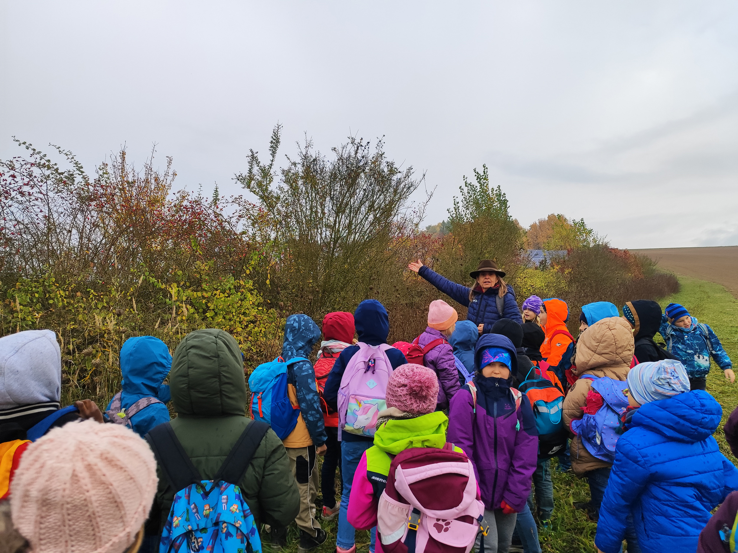 Die VR-Bank Landau-Mengkofen ermöglicht es hier Schulklassen kostenlose Führungen zu erleben, die neben der Vermittlung von Wissen auch den Spiel- und Spaßfaktor nicht zu kurz kommen lassen. So wurden die Klassen von Kathy Linnbrunner und Julia Ziegler vor dem Erlebnispfad in Empfang genommen. Die beiden Expertinnen verstanden es geschickt, die Kinder auf vielfältige Weise für das Thema zu motivieren. So ging man zunächst in gemütlichem Tempo an der Hecke entlang und betrachtete die dort vorhandenen Heckenfrüchte. Die üppige Hecke bot konkretes Anschauungsmaterial für Hagebutte, Haselnuss, Pfaffenhütchen, Schlehe und vieles mehr.