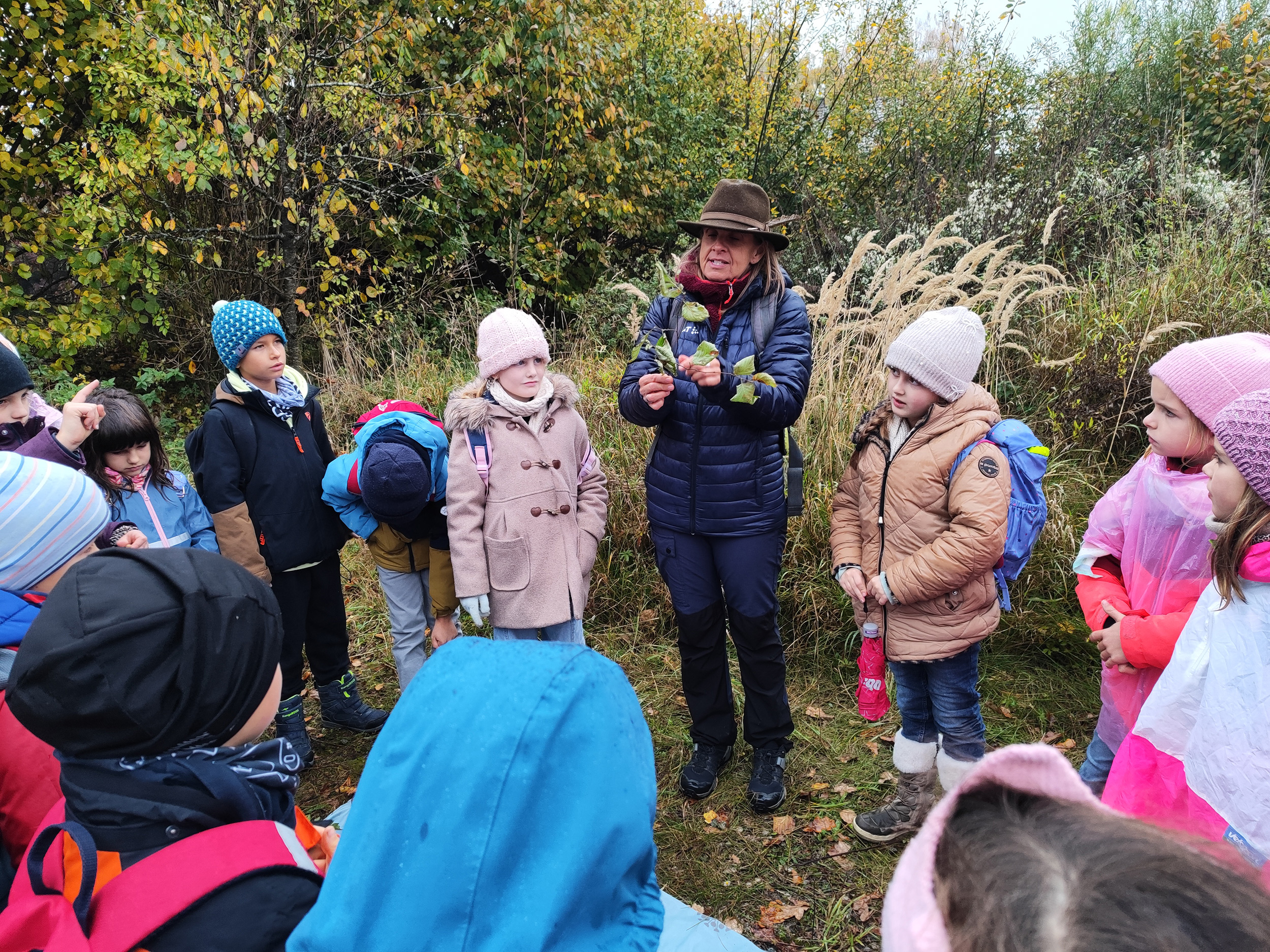 Die VR-Bank Landau-Mengkofen ermöglicht es hier Schulklassen kostenlose Führungen zu erleben, die neben der Vermittlung von Wissen auch den Spiel- und Spaßfaktor nicht zu kurz kommen lassen. So wurden die Klassen von Kathy Linnbrunner und Julia Ziegler vor dem Erlebnispfad in Empfang genommen. Die beiden Expertinnen verstanden es geschickt, die Kinder auf vielfältige Weise für das Thema zu motivieren. So ging man zunächst in gemütlichem Tempo an der Hecke entlang und betrachtete die dort vorhandenen Heckenfrüchte. Die üppige Hecke bot konkretes Anschauungsmaterial für Hagebutte, Haselnuss, Pfaffenhütchen, Schlehe und vieles mehr.