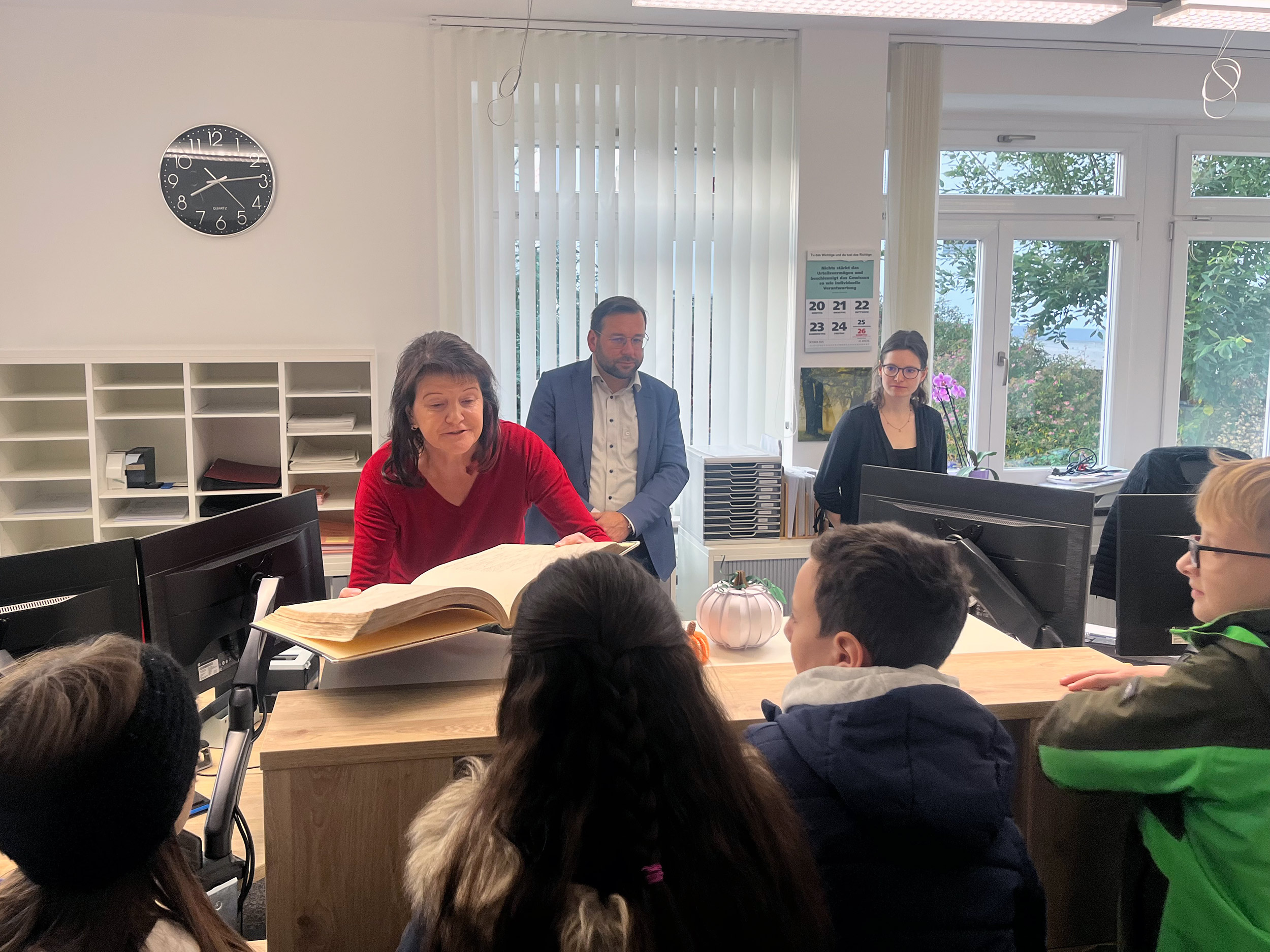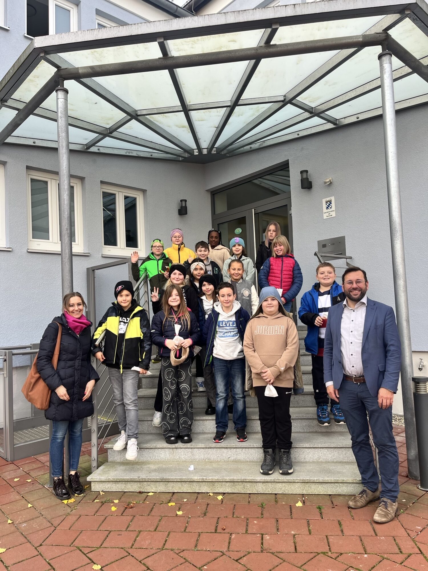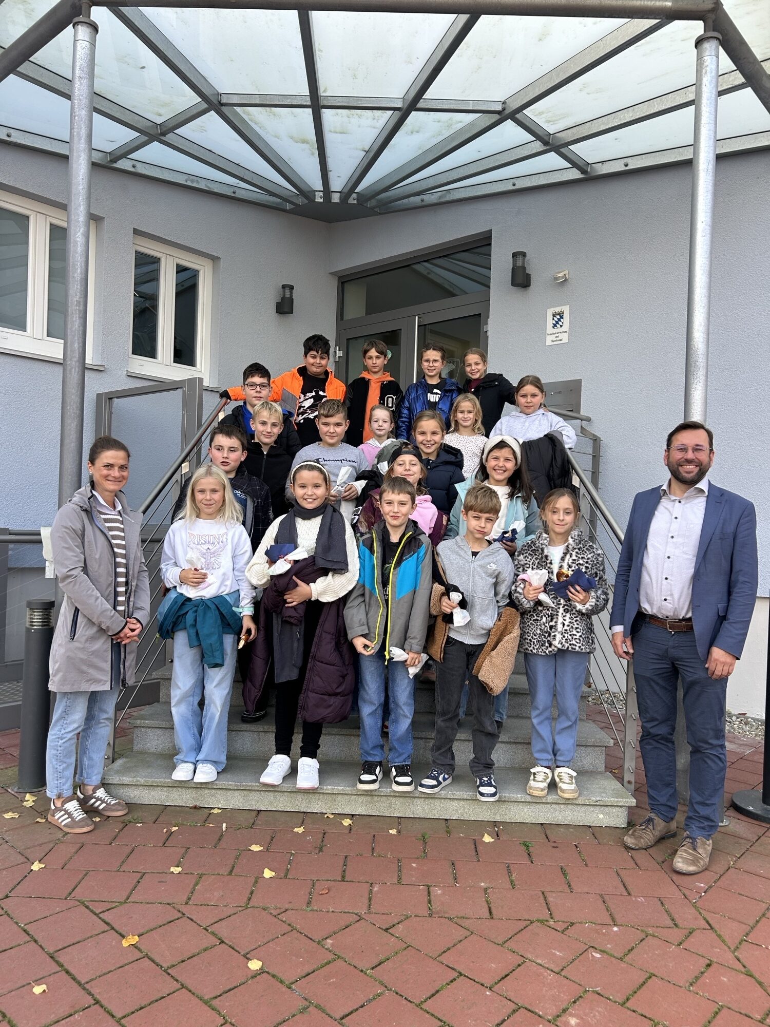 Nachdem der 1. Bürgermeister Thomas Hieninger die Schulklasse im Foyer empfangen hatte, führte er uns durch die verschiedenen Ämter und so konnten die Kinder die Mitarbeiter und ihre jeweiligen Aufgaben besser kennenlernen. Die Grundschüler waren beeindruckt von den vielen Arbeitsbereichen, die im Rathaus erledigt werden müssen.