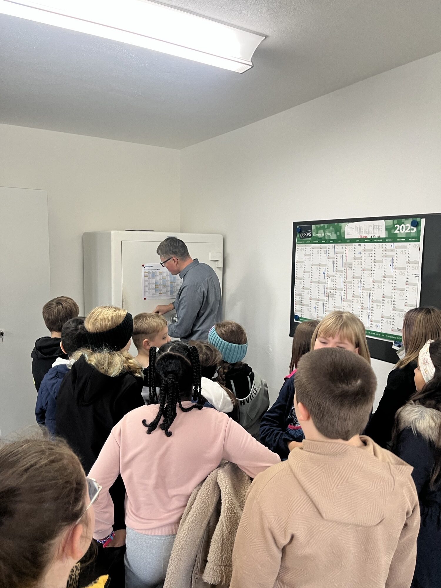 Besonders angetan waren die Schülerinnen und Schüler, als Kämmerer Patrick Payer ihnen den Tresor in der Gemeinde zeigte. Mithilfe von 2 Schülerinnen öffneten sie den schweren Stahlschrank und bestaunten die Bürgermedaillen in Gold und Silber.