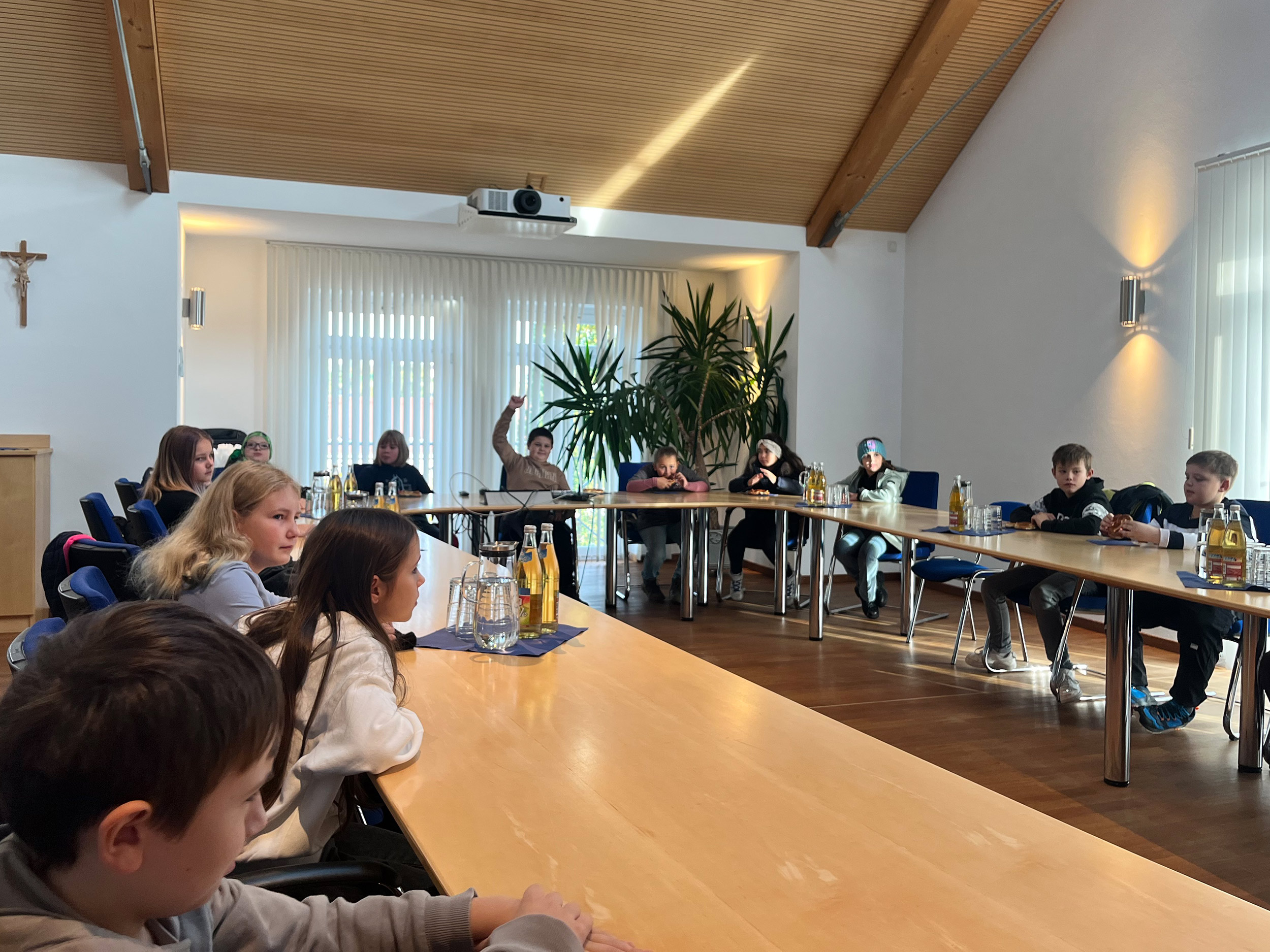 Am Ende lud Herr Hieninger die 4. Klässler in den großen Sitzungssaal ein, wo die Kinder mit Interesse ihre vorbereiteten Fragen stellen durften. Viele Kinder wollten wissen, wie man Bürgermeister wird, ob er viel arbeitet und ob ihm seine Arbeit Spaß macht. Geduldig beantwortete Thomas Hieninger jede einzelne Frage und überraschte zum Schluss alle mit Getränken und Butterbrezen, worüber sich die Kinder sehr freuten.